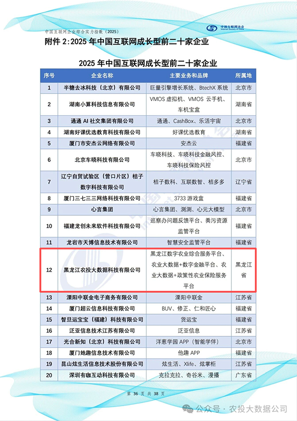 农投喜报丨连续三年!农投大数据公司入选“2025年中国互联网成长型前二十家企业”!