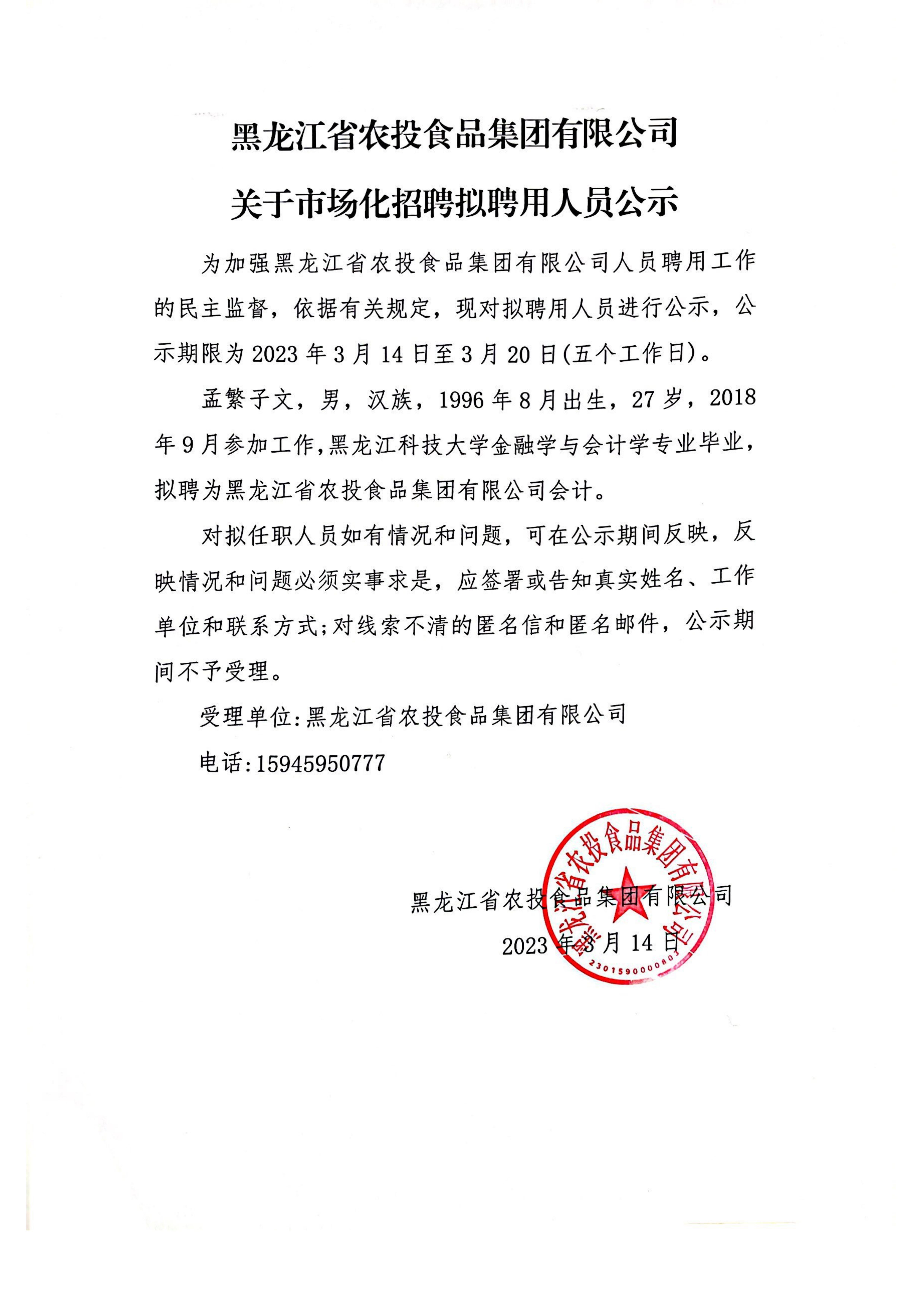 黑龙江省农投食品集团有限公司关于市场化招聘拟聘用人员公示