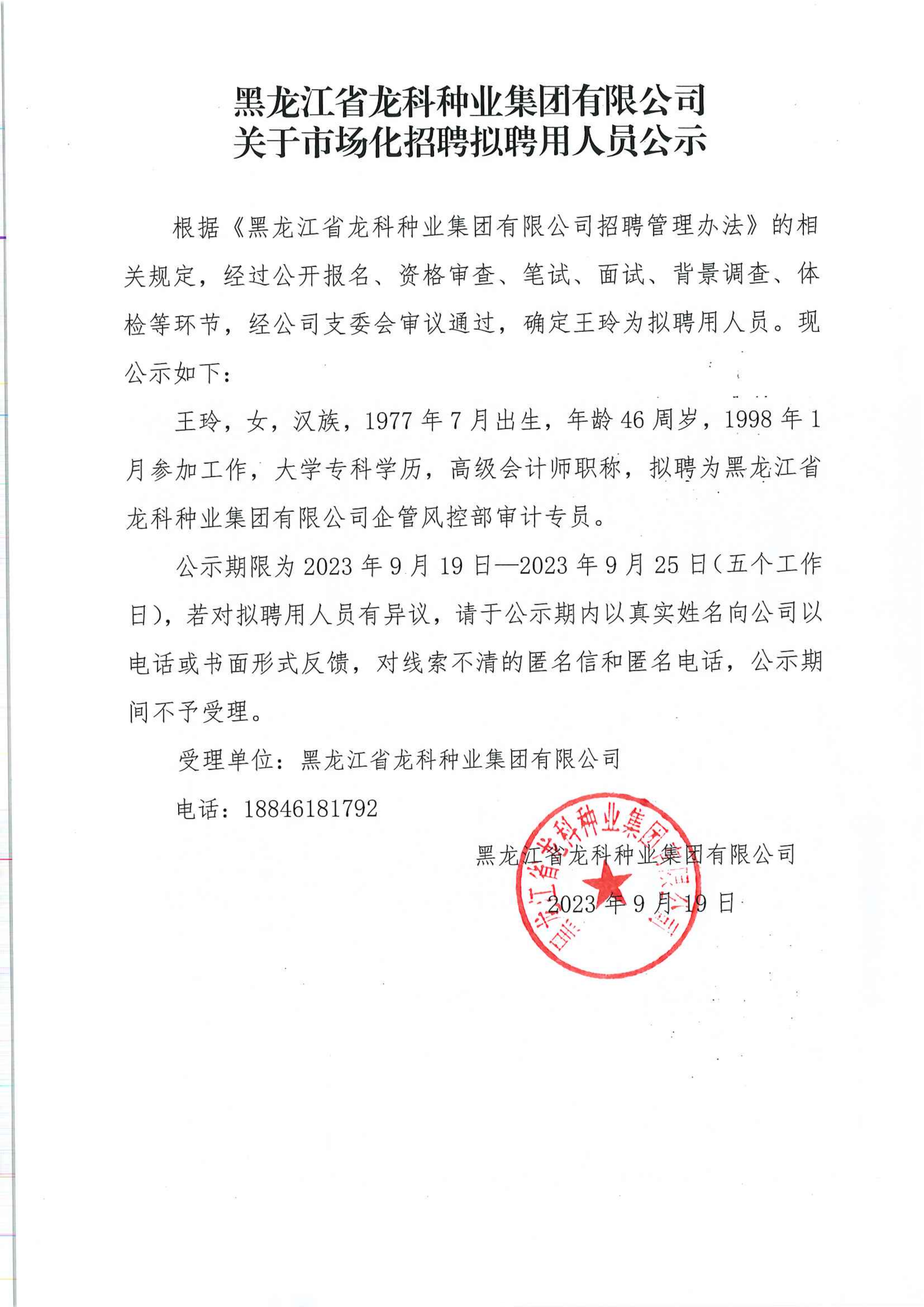 黑龙江省龙科种业集团有限公司关于市场化招聘拟聘用人员公示