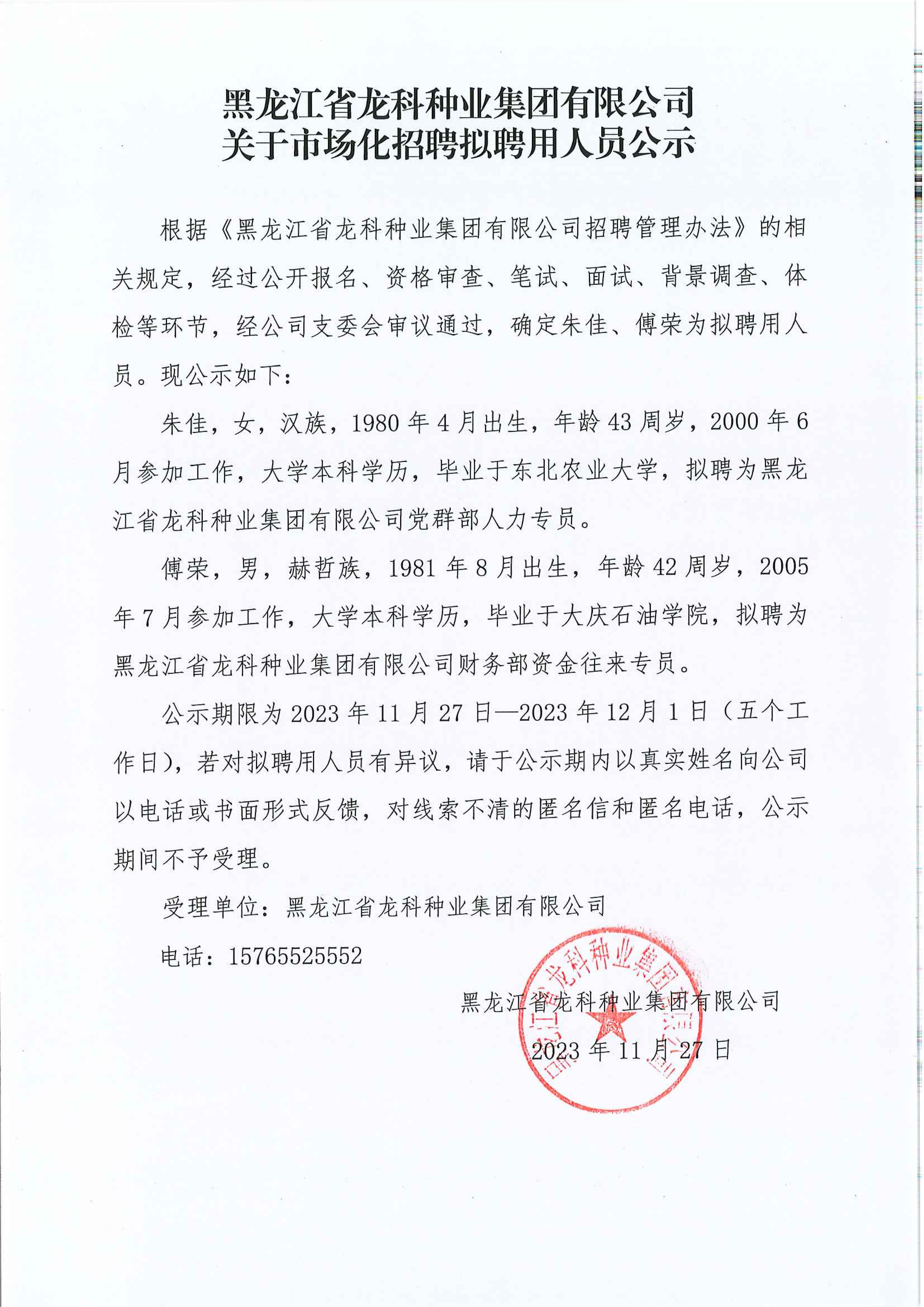 黑龙江省龙科种业集团有限公司关于市场化招聘拟聘用人员公示