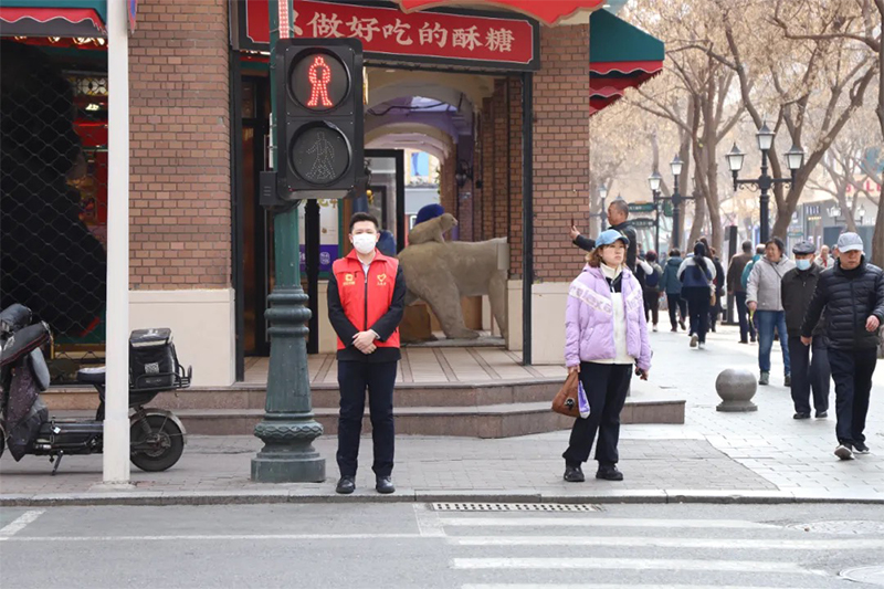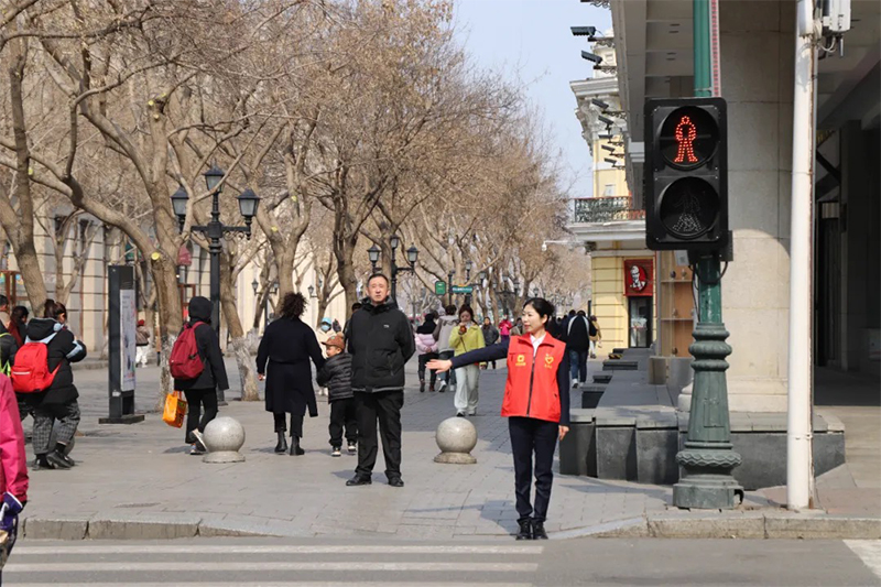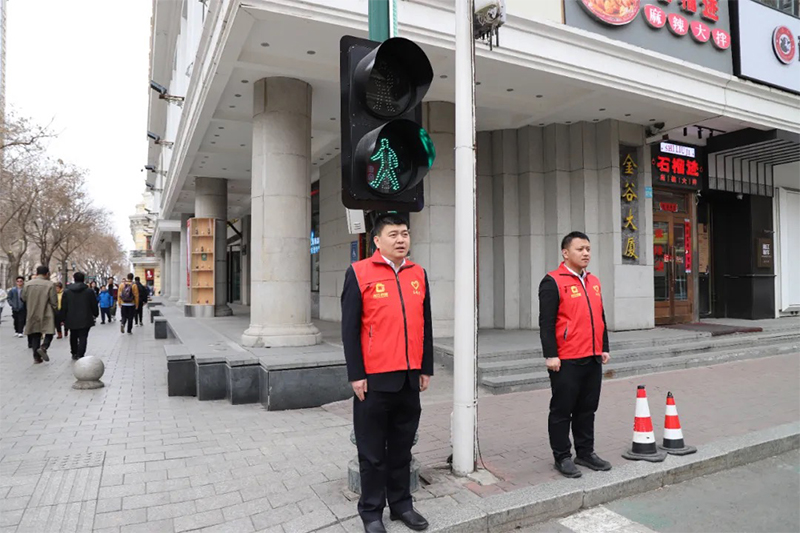 初春的哈尔滨,依然有些寒风料峭。金谷大厦党员、团员志愿者们身穿红色马甲,每两人为一组,在中央大街西二道街与上游街交口进行交通协管志愿服务,根据交通信号灯,提示过往行人遵守交通法规,文明出行。对无视通行信号的行人进行劝回,提醒注意交通安全;对询问地点、方向的行人给予耐心解答、温馨相助。