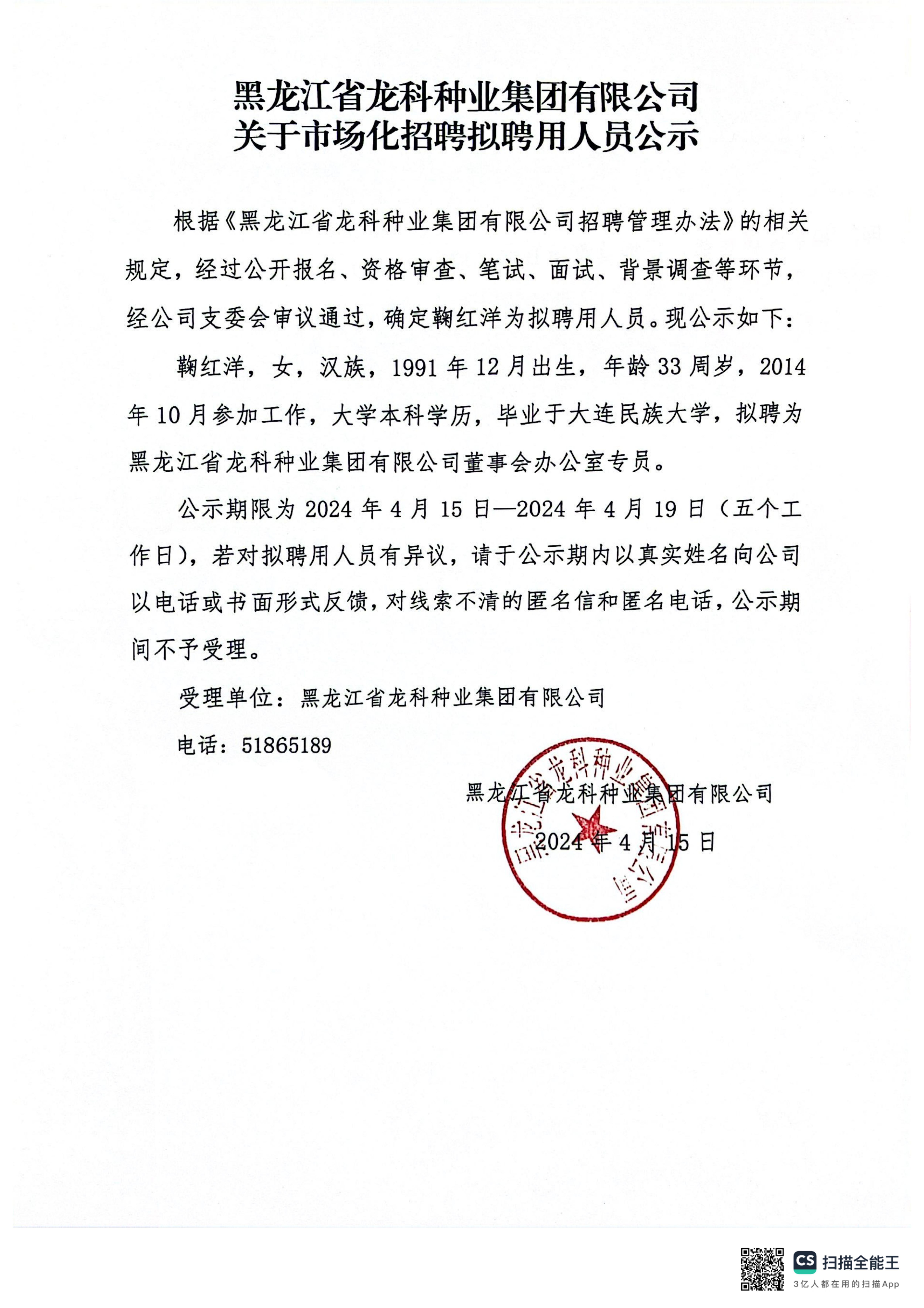 黑龙江省龙科种业集团有限公司关于市场化招聘拟聘用人员公示