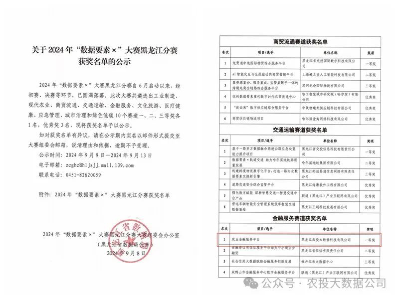 9月9日,大数据公司参加的2024年“数据要素X”大赛黑龙江分赛决赛结果出炉。大数据公司参赛项目“农业金融服务平台”在金融服务赛道中荣获一等奖,将代表黑龙江省参加全国总决赛,展现我省在农业金融服务领域的创新实力!