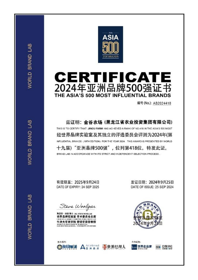 9月25日,由世界品牌实验室(World Brand Lab)主办的2024年“亚洲品牌大会”在香港举行,会上发布了2024年《亚洲品牌500强》排行榜。好博网页版有限公司(以下简称“农投集团”)“金谷农场”品牌再次荣登《亚洲品牌500强》排行榜第418位,较2023年的436位,提升了18位,再一次提升了“金谷农场”的品牌影响力和企业的核心竞争力,这一卓越成就为黑龙江省的农业品牌发展也增添了浓墨重彩的一笔。