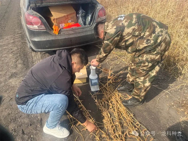 生产中心人员在大豆繁育田进行大豆品种测水取样