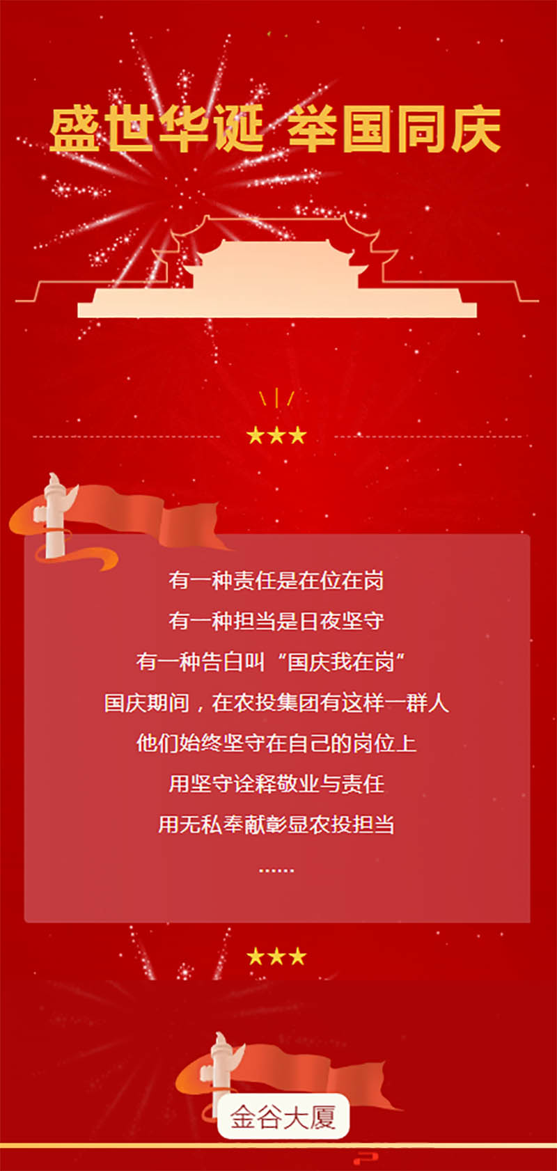 “功崇惟志,业广惟勤。”农投金谷人在平凡的岗位上兢兢业业,以昂扬的姿态庆祝中华人民共和国成立75周年,用奋斗书写着高质量发展的新篇章。