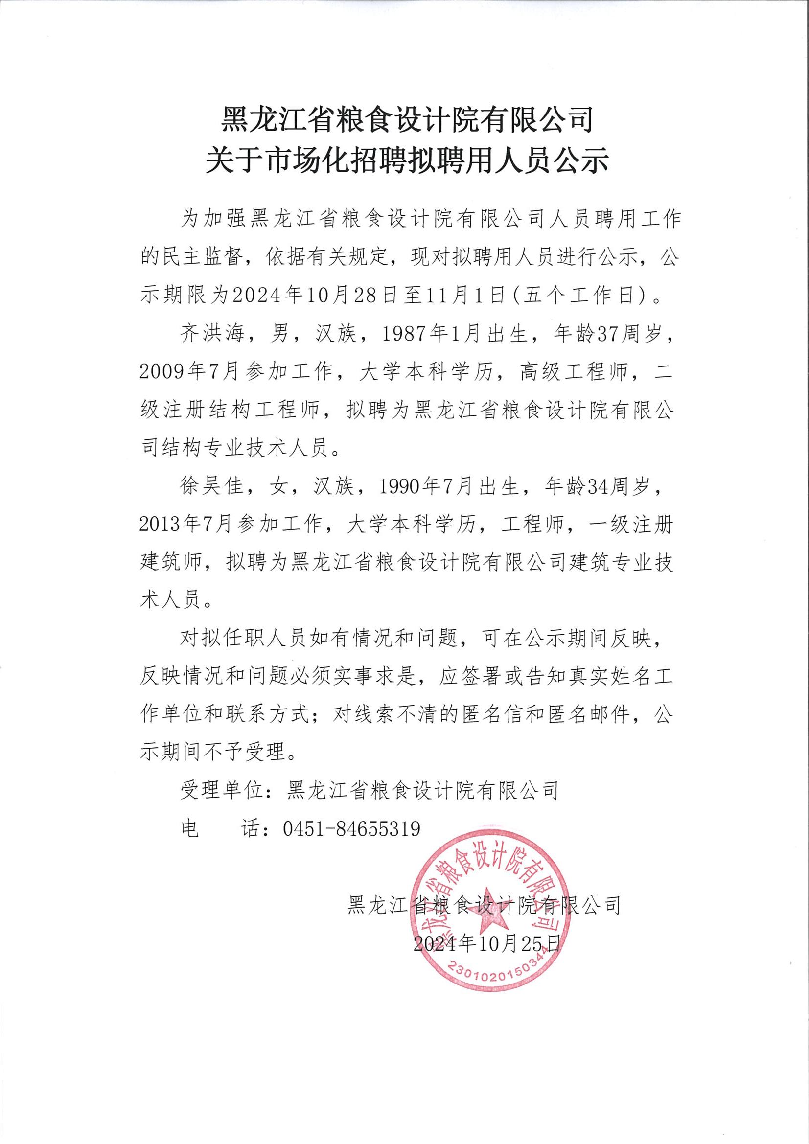 黑龙江省粮食设计院有限公司关于市场化招聘拟聘用人员公示