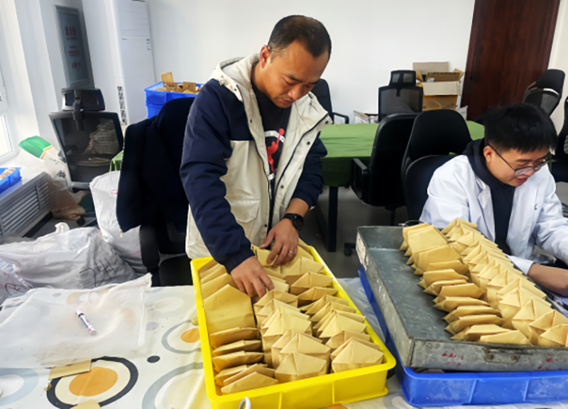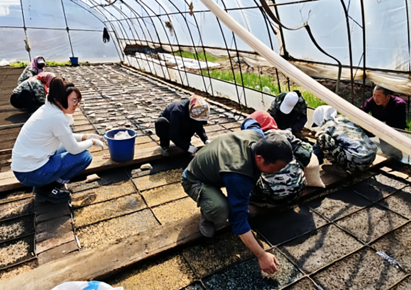△研发中心人员在试验大棚进行水稻材料播种育苗。