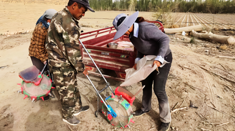 △生产中心人员在新疆繁育田进行玉米亲本繁育播种。