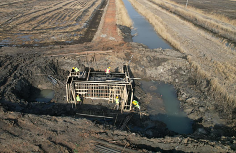 △肇源县盐碱地综合利用试点项目第一标段项目,施工人员正在退水闸模板支护施工。