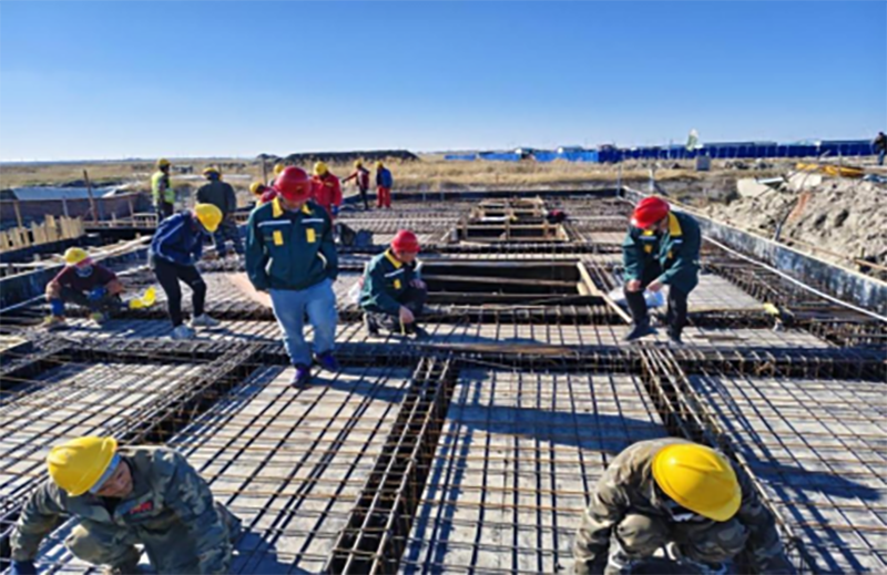 △肇源县盐碱地综合利用试点项目第一标段项目,施工人员正在二号墙排站,进行钢筋绑扎施工,管理人员检查施工质量。