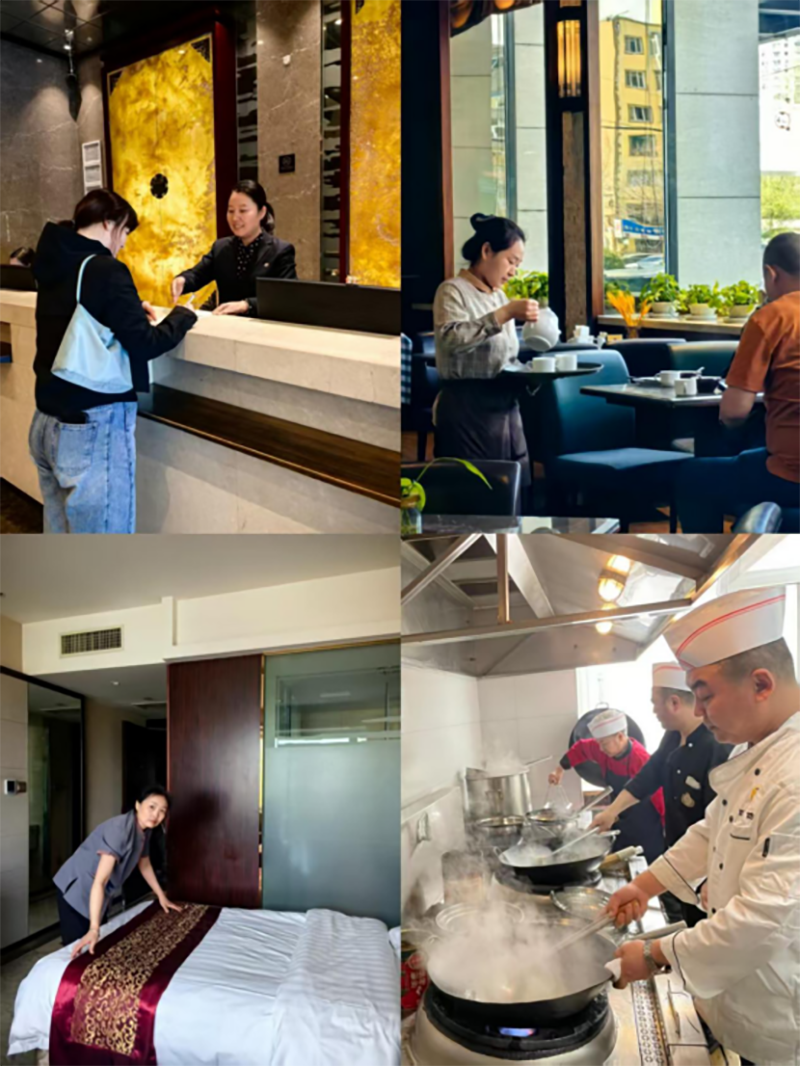 △工作人员以最饱满的热情接待每一位宾客。 清晨六点,天刚蒙蒙亮,厨房已飘出阵阵香气,厨师团队早已穿戴整齐,开始为早餐供应做准备。在五一用餐高峰期,厨师们颠勺翻炒的节奏快如鼓点,砧板上的切菜声、油锅的滋啦声交织成激昂的交响曲。服务员的脚步声、宾客觥筹交错的碰杯声,共同奏响了热闹非凡的假日乐章。 △工作人员与客户沟通、打扫客房。 △以最平凡的坚守诠释劳动者的责任。 △以最专业的服务展现劳动者的风采。 作为酒店运行的坚强后盾,安保部加大对酒店设施设备的巡检力度,对电梯、空调、水电系统等进行24小时实时监控,确保酒店的安全秩序。财务部紧盯系统,实时记录每一笔收入,客房的预订款项、餐饮的消费账单、会议场地的租赁等费用,确保每一笔资金流向清晰可查、数据精准。采购部凭借丰富的经验与敏锐的眼光,仔细挑选每一样食材,严格把稳食品安全关。综合部认真地检查了车辆运行情况,为公司各部门提供良好的车辆保障。 △以最负责的态度为一线提供服务保障。 在这个五一假期,金谷大厦用坚守和奉献,为客人打造了一个温馨、舒适、安全的居住环境,让每一位来到酒店的客人都能感受到家的温暖和酒店的优质服务。他们以实际行动践行着酒店的服务理念,诠释着劳动的价值和意义。