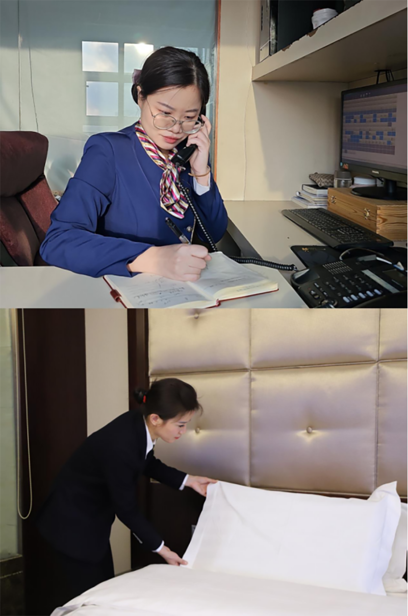 近期,酒店预订量飙升,前台员工们提前到岗,仔细梳理当日预订信息,知悉每一位客人的基本情况。从清晨到深夜,他们始终保持微笑,热情接待每一位抵店的客人。他们用优质、高效、真诚的服务,让每一位宾客感受到宾至如归的温暖。还有他们秉持真诚服务态度,迈着矫健的步伐,穿梭于各个会议室中,让各个会议室保持干净整洁、桌椅排放整齐的状态,只为给宾客提供良好的会议保障。