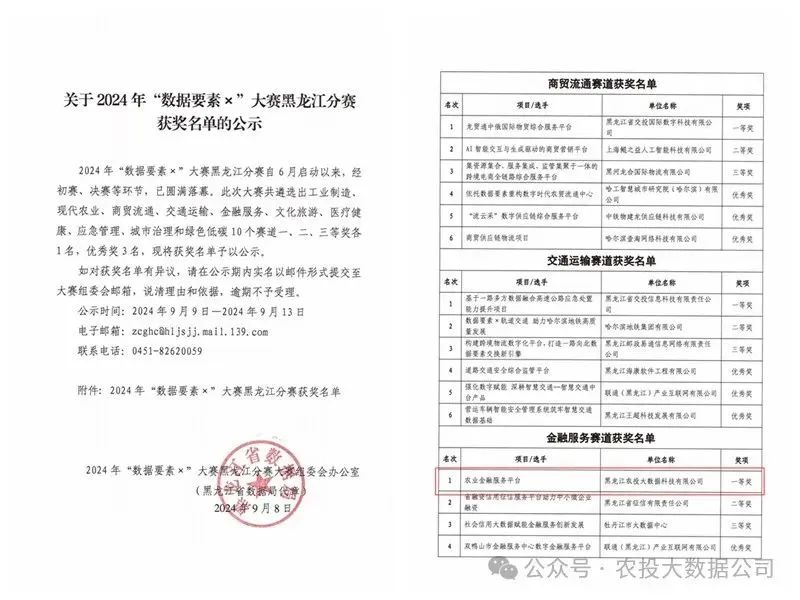 2024年6月,在省农业农村厅推荐下,黑龙江省农业大数据金融服务平台被人民银行黑龙江省分行评为“金融科技赋能乡村振兴示范工程”项目,成为省内唯一入选的企业运营示范工程,实现了从“金融支农服务创新试点”到“示范工程”的成功蜕变。同年8月,在省数据局主办的《2024年“数据要素×”大赛黑龙江分赛区决赛》中,团队凭借农业金融场景智能化解决方案,荣获黑龙江分赛区金融服务赛道一等奖,团队参加“数据要素X”黑龙江省分赛区决赛,获得金融赛道一等奖。这些成果体现了团队在推动农业数字化转型中的实践价值。