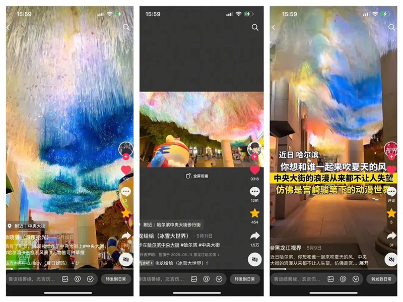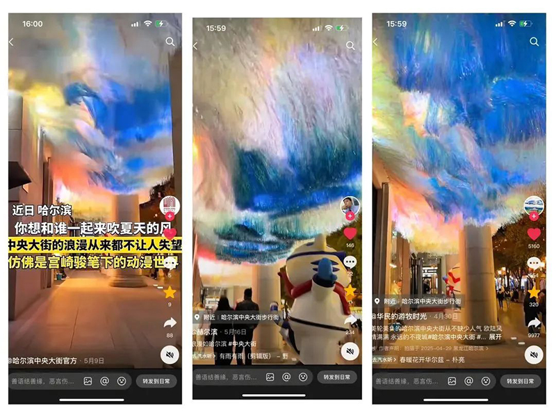 立足“酒店即目的地”的发展定位,金谷大厦借鉴西安、厦门等城市网红地标运营经验,于避暑旅游旺季来临前完成“天空之境”主题美陈场景建设。该场景占地约66平方米,以动态艺术装置重构空间美学——采用特种细丝面料打造由北向南延展的“尔滨浪花”矩阵,通过微风动力学装置模拟江海与天穹的光影交织,构建虚实交融的沉浸式视觉空间。自落成以来,该场景日均吸引游客及摄影创作者超2000人次,在抖音、小红书等平台形成“#尔滨天空之境”话题矩阵,相关短视频播放量突破1200万次,成功跻身哈尔滨城市地标打卡热榜TOP10。
